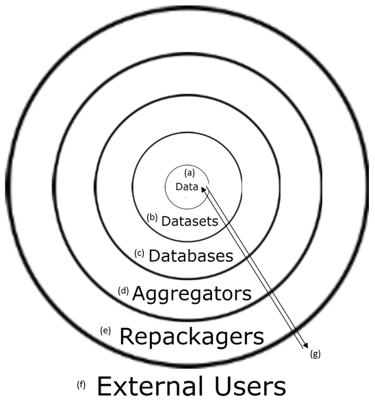 Legend: (a) Data and metadata make up (b) datasets. Multiple datasets in one location form a (c) database. (d) Aggregators compile data from many databases and (e) repackagers transform data in a way that makes it more accessible for all audiences (i.e. lay and professional). (f) External users (e.g. scientists, industries, government agencies etc.) access raw data by (g) going through any or all of these data sharing portals.