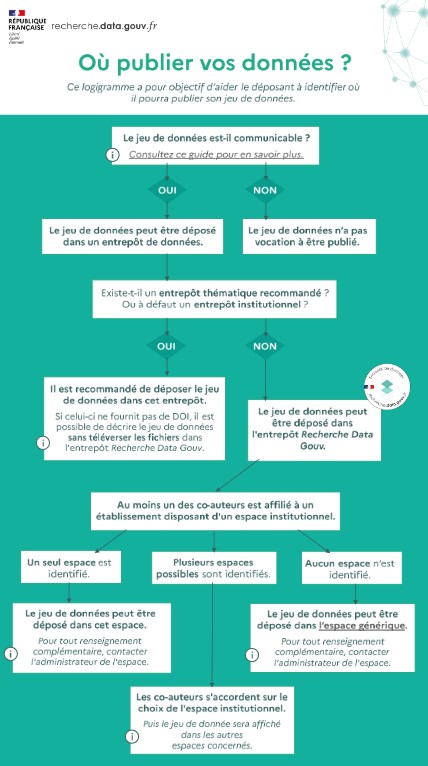 It is recommended to prioritize deposits in trusted thematic repositories (eg. InDoRES, SEANOE, …), or failing that in institutional repositories (eg. Data SUD, CIRAD Dataverse, …), or failing that, in generic repositories such as the Recherche Data Gouv repository. Resources exist for choosing the adapted and recommended data repository.
